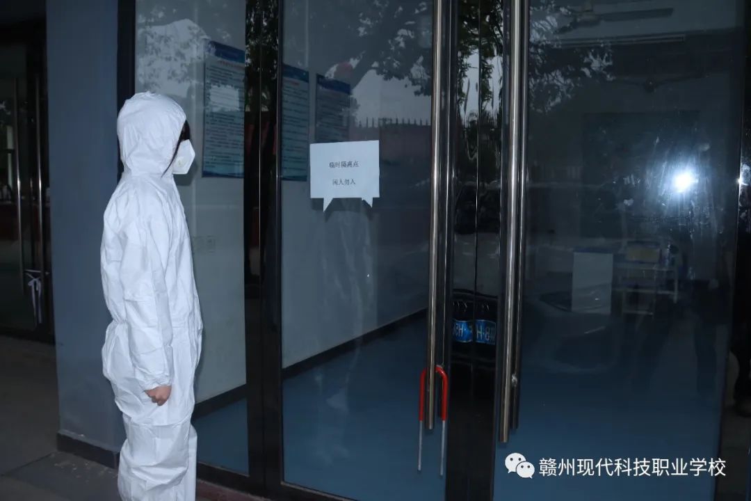(场景模拟)学校突然接到赣州市中医院来电,昨日全员核酸检测中有一组混检人员中检测出阳性。 随即触发学校疫情防控应急响应。按照学校疫情防控突发处置有关预案的规范流程,全程模拟了响应启动、信息报告、封闭管理、流调、体温检测、转运、消毒消杀等全过程、全要素。