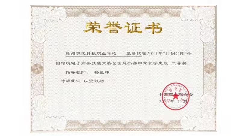 欢迎光临喜报!恭喜我校张贤铭同学在2021年“ITMC杯”全国跨境电子商务技能大赛全国总决赛中荣获学生组“二等奖” 发布时间:2021-10-21 点击数:649-通知公告-赣州现代科技职业学校-赣州现代科技职业学校