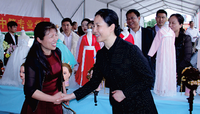 郭素芳(右)等领导亲临我校学生作品现场指导